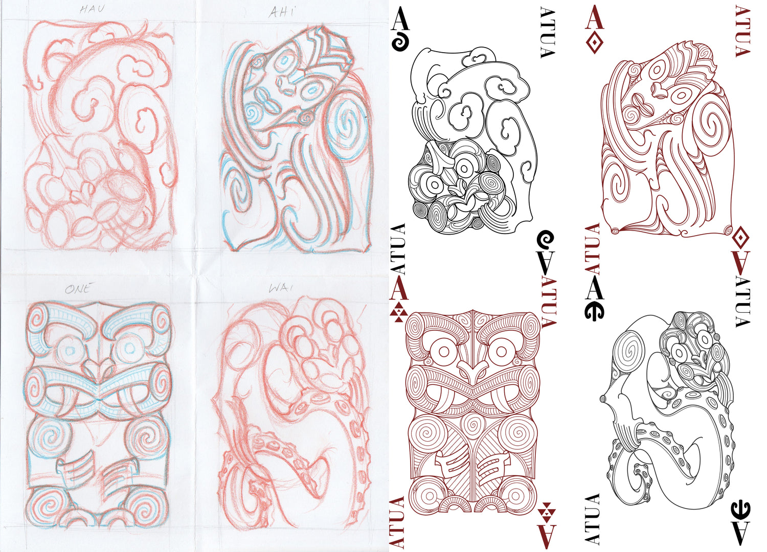 THIS DECK CONTAINS A UNIQUE SET OF CUSTOM SUITS AND COURT CARDS LOOSELY BASED ON TRADITIONAL PLAYING CARDS, FIRST INTRODUCED TO MĀORI BY EARLY EUROPEAN SETTLERS.